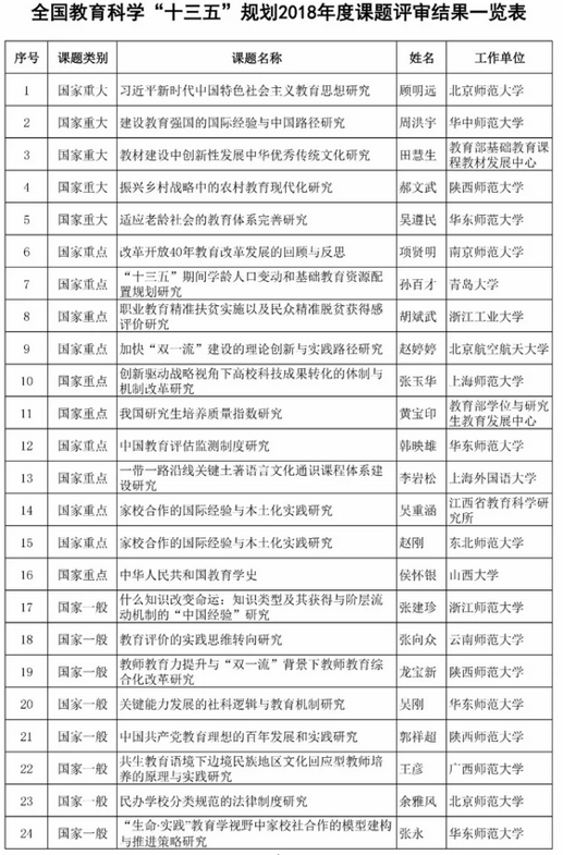 三、全国教育科学“十三五”规划2018年度课题评审结果一览表(部分)