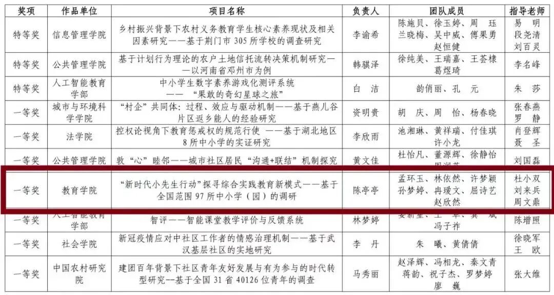 为了深入贯彻落实总书记实践育人的指示精神,“新时代小先生”项目组秉持“新时代小先生”理念,和多单位合作实施“新时代小先生行动”,并参加华中师范大学第十五届“挑战杯”。本项目组的作品“‘新时代小先生行动’探寻综合实践教育新模式——基于全国97所中小学(园)的调研”,在比赛中获得校赛决赛一等奖。