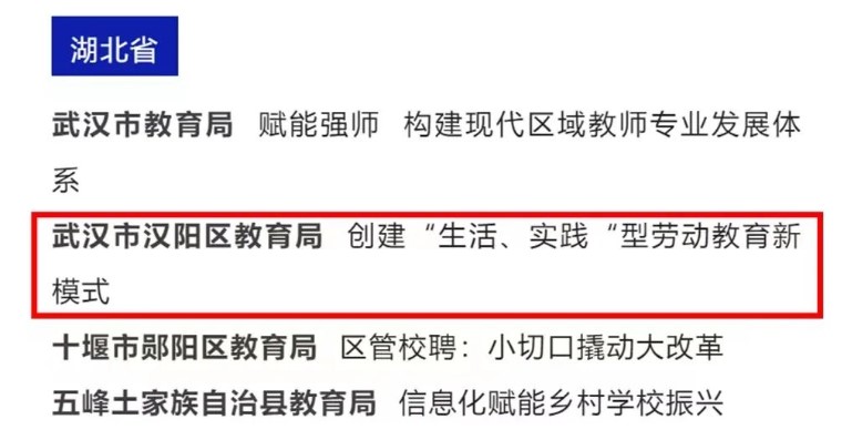 汉阳区作为湖北省首个“生活·实践”教育实验区,区教育局及相关政府部门、华中师范大学、全区中小学三个教育主体协同合作,携手共进,回应新时代劳动教育新要求,落实劳动教育课标精神,组建专家团队,扎根生活实践,将“生活·实践”教育理论与劳动教育有机结合,其阶段性成果在首届教育局长高峰论坛(2022)中获得广泛关注,并作为优秀案例进行宣传推广。