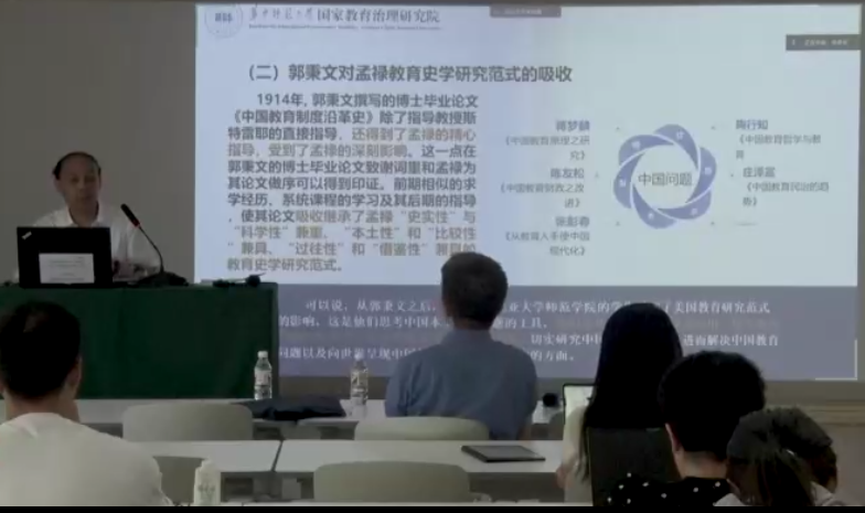 讲座围绕郭秉文先生在现代中国教育研究领域的贡献展开,聚焦于其在实证量化研究范式,哲学思辨研究范式和教育历史研究范式方面的创新。讲座伊始,周洪宇教授以对郭秉文和与郭秉文同时代的蒋梦麟、胡适、陶行知等教育学人的介绍引入,指出郭秉文对桑代克、杜威、孟禄等西方教育界大家教育范式的学习、移植和中国化;强调郭秉文是中国现代教育学科的奠基者和开创者,引进、传播并结合中国实际改造了西方的教育学说,对中国教育学科的发展产生了深远影响。