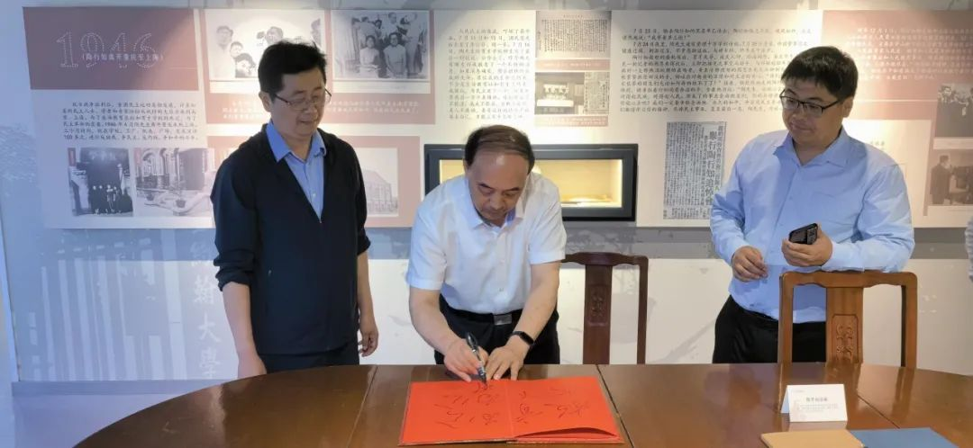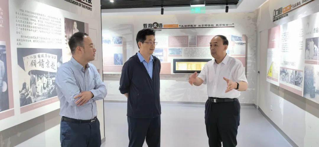 周洪宇教授一行在沈伟校长的带领下参观了行知中学的陶行知纪念馆和校史馆,结合馆藏内容详细解读了陶行知教育思想的形成和成熟的过程。