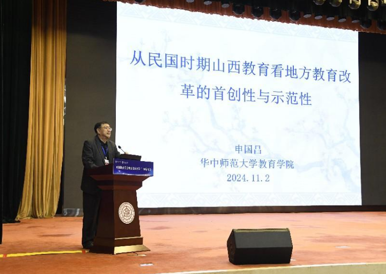 接着,申国昌教授以《从民国时期山西教育看地方教育改革的首创性与示范性》为题在大会上作主题报告。申国昌教授指出,民国时期山西教育是全国教育变革的先行者,其成功的改革策略为后世教育发展提供了宝贵的经验与借鉴。申国昌教授围绕民国时期山西教育在变革中的整体发展、首创性举措、示范性经验三个方面进行了深刻阐述。他指出,民国时期山西教育在国民教育、人才教育、职业教育、社会教育四个方面协同发力,均取得了显著的教育成效,尤其是义务教育普及率高居全国首位。整体而言,民国时期山西教育变革的成功得益于社会需求驱动、地方政府重视、办学权利自主、教育智慧团指导、民众的积极参与和国外经验的借鉴等。这些因素共同推动了地方教育的改革与发展,为后世教育改革提供了示范和借鉴。