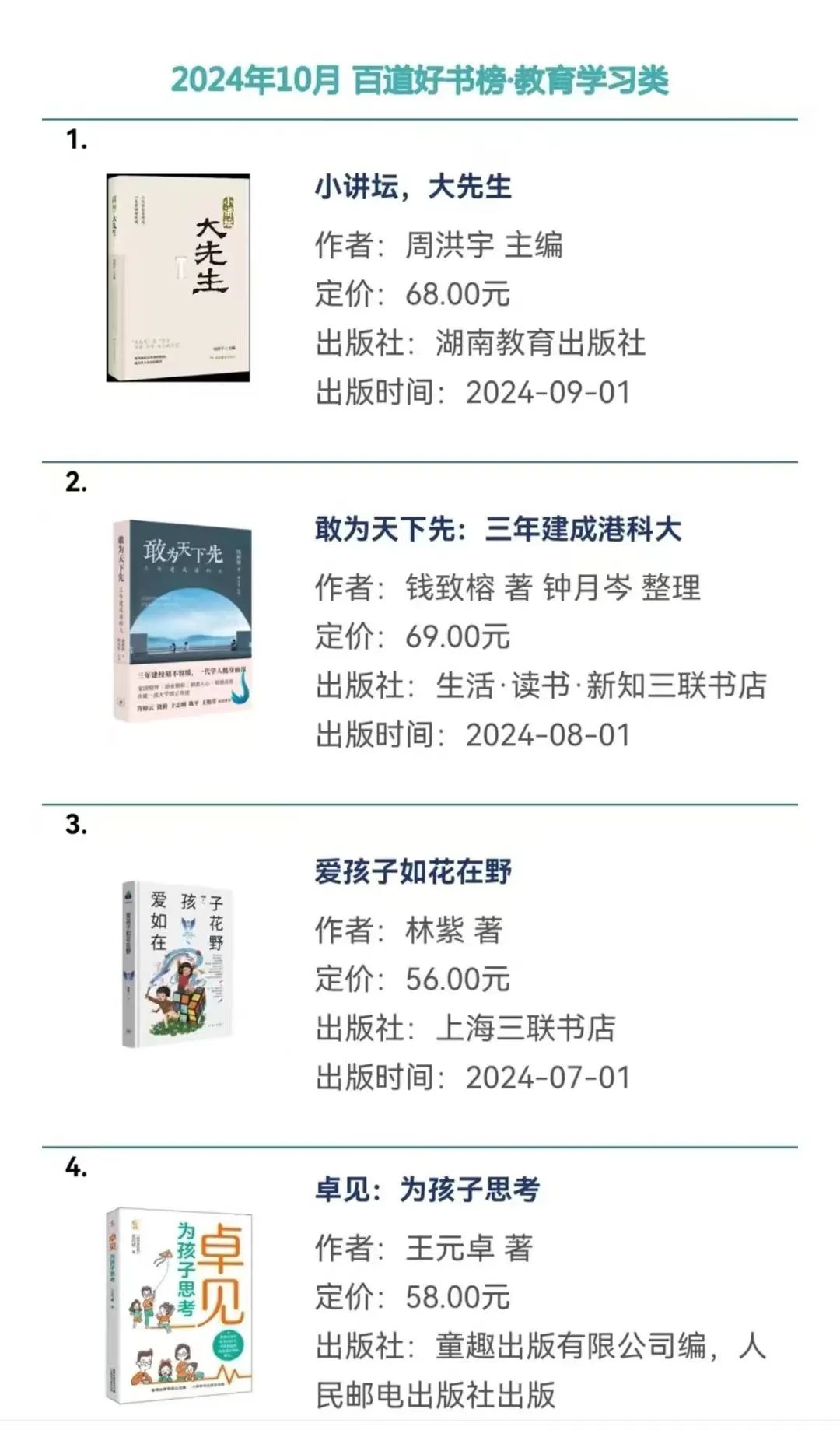 11月1日,2024年10月百道好书榜发布,周洪宇新作《小讲坛,大先生》荣登教育学习类榜首。