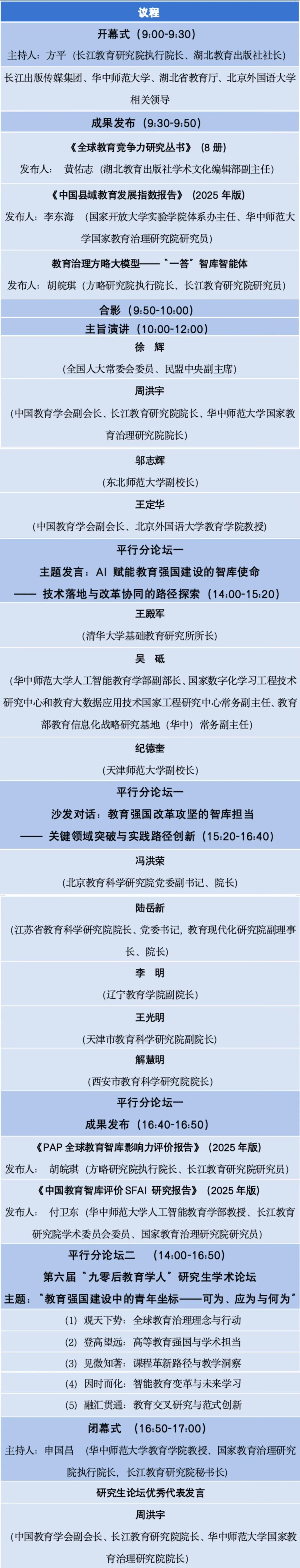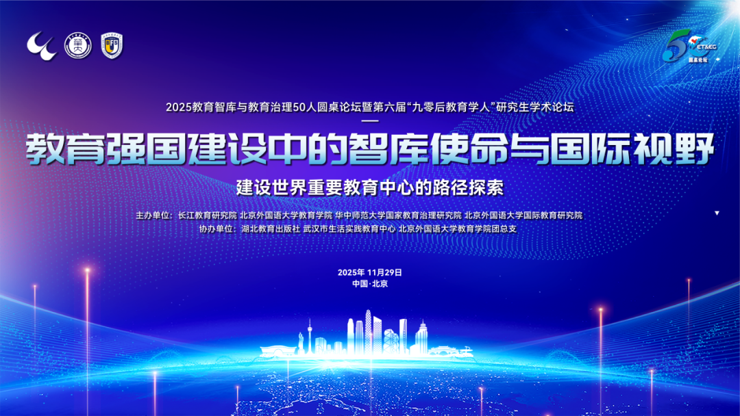 在推动教育强国建设从蓝图走向落实的关键时期,教育智库成为衔接国家战略与一线实践的桥梁,也是参与全球教育治理的重要平台。为此,长江教育研究院、华中师范大学国家教育治理研究院携手北京外国语大学教育学院,将于2025年11月29日在北京共同举办“2025教育智库与教育治理50人圆桌论坛”。同期举办第六届“九零后教育学人”研究生学术论坛,倾听青年学者声音,为教育发展注入智库力量与青春动能。