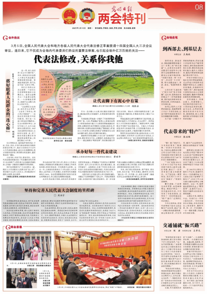 代表法的修改,将为全过程人民民主提供更完善的法治保障。草案通过细化代表联系群众的具体路径,将人民民主体现在日常治理中。比如,根据草案规定,乡镇人大主席团可以定期组织代表进社区、访企业,使民意表达更直接、问题解决更高效,彰显了“全链条、全方位、全覆盖”的人民民主特征。