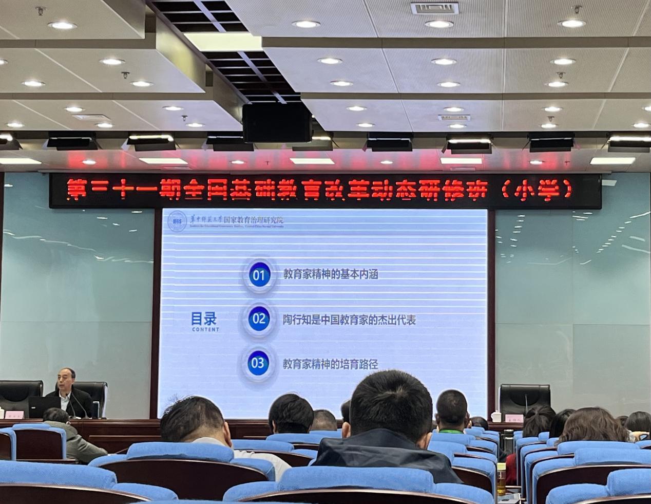 12月5日,周洪宇院长受邀参加第31期全国基础教育改革动态研修班,为来自全国各地的上百位小学校长讲授《弘扬教育家精神,做行知式大先生》主题报告,周院长从习近平总书记对教育家精神的论述开始讲起,引出中国教育家的杰出代表陶行知先生,讲述了陶行知的教育经历和七大教育运动,并向现场各位校长展示了许多宝贵的历史照片,引起了现场学员的强烈学习兴趣,授课现场氛围热烈。