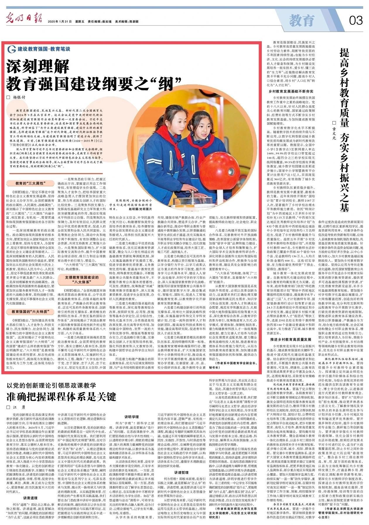 《纲要》提出,“坚定不移走中国特色社会主义教育发展道路,坚持社会主义办学方向,全面把握教育的政治属性、人民属性、战略属性”,深刻揭示了中国特色社会主义教育的“三大属性”。“三大属性”内涵丰富、相互联系、有机统一,需要贯通和体现到教育强国建设的各方面和全过程。